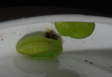 2008年9月3日 大阪市淀川区 机の上にソテツの鉢や、豊中産などを飼うためにマメを抜いたインゲンのさやを置いていたところ、餌を探してソテツから降りてきた幼虫がさやに食いついていました。豆よりさやの方がよい餌になるのかもしれません。 トップページへ |
