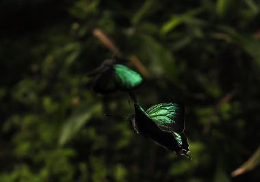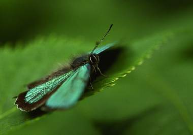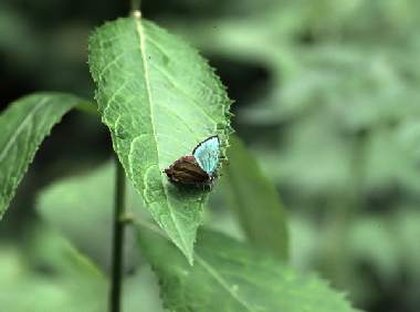 (参考) 占有行動(♂) 1992年7月26日 長野県新穂高 高いところで占有行動を見せるミドリシジミ類が多い中で、メスアカミドリシジミは目の高さぐらいで行なうことが多いようで、輝く翅表を撮りやすい種です。信州では比較的容易に撮影できる場所があり、そういうところに遭遇すれば、そこは一瞬にして天国になります。なお、大きい写真は ゼフィルス2からどうぞ。 トップページへ |