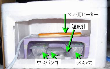 (参考) 孵化準備 2010年1月31日 撮影 静岡市駿河区 飼育 2009年秋 滋賀県北部 採卵 近くのホームセンターでカワヅザクラ(河津桜)の苗木の花芽がふくらみかけているのを見て、居ても立ってもいられずこれを買い、冷蔵庫からメスアカミドリシジミの卵を取り出しました。枝に付いている卵をカッターで切り出し、100均で飼った容器にティッシュペーパーを敷いて水道水で湿らし、ここに卵を置きました。まだ部屋の中は寒いので、発泡スチロールの箱、段ボールの箱、ペット用のヒーター(ハイペット(株)製、100V 10W)で、孵卵器を作ってそこに入れました。最初ヒーターより上部に卵容器を置いたところ、ティッシュが乾き上部が寒くて結露したので、ヒーターが卵容器の上になるように工夫してみました。温度計は大体22℃ぐらいを示していました。 トップページへ |