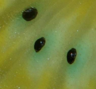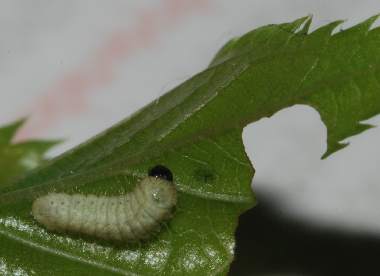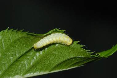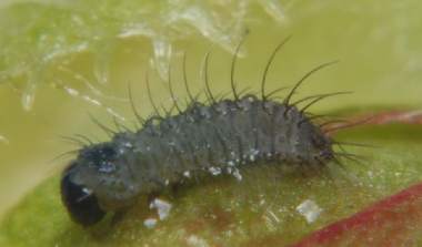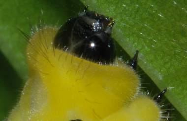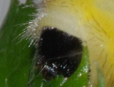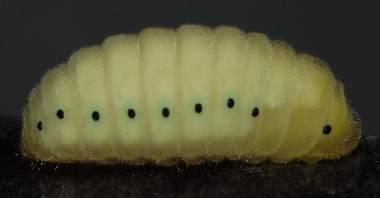 (参考) 脱皮後の幼虫(2齢、4.4mm) 2010年2月8日撮影 静岡市駿河区 飼育 2009年秋 滋賀県北部 採卵 2齢になって、花粉も食べるかもしれませんが、開いた花の花粉はあまり興味が無さそうだったので、開いてきた若葉を与えるとよく食べます。 トップページへ |