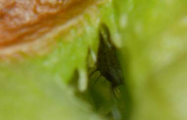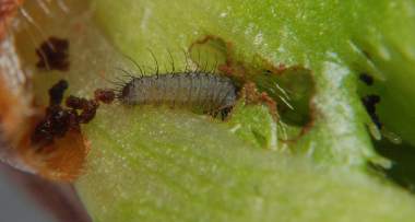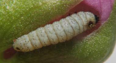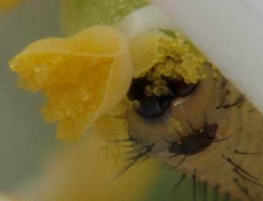 (参考) 花粉を食べる幼虫(1齢、個体2) 2010年2月7日撮影 静岡市駿河区 飼育 2009年秋 滋賀県北部 採卵 2月5日に孵化した個体2です。ずっとカワヅザクラの蕾の中にいたのですが、開いてくると中で花粉にまみれて葯・花粉を食べているのが分かりました。 トップページへ |