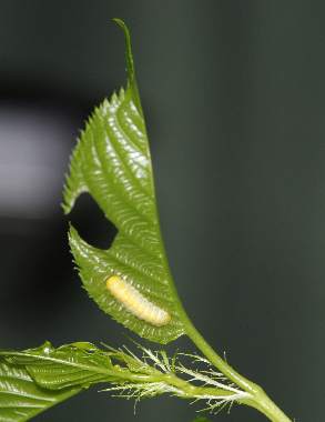 (参考) 脱皮前の幼虫(2齢) 2010年2月11日撮影 静岡市駿河区 飼育 2009年秋 滋賀県北部 採卵 葉裏で眠に入りました。葉脈を残して葉を食べていたことがよく分かります。 トップページへ |