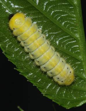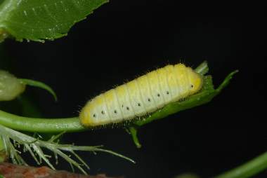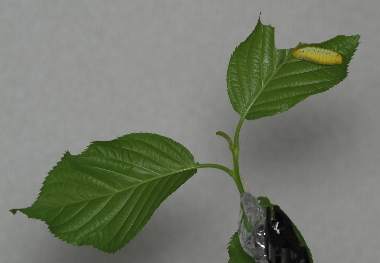 (参考) 葉を食べる幼虫(2齢、8mm) 2010年2月8日撮影 静岡市駿河区 飼育 2009年秋 滋賀県北部 採卵 次第に黄色みが強くなってきました。 トップページへ |