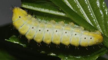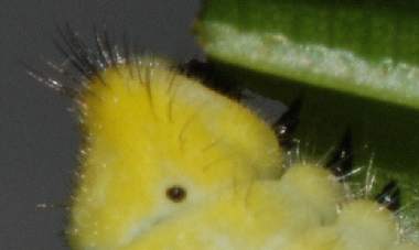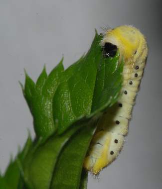 (参考) 摂食中の幼虫(4齢) 2010年2月16日撮影 静岡市駿河区 飼育 2009年秋 滋賀県北部 採卵 1日で眠から開け終齢(4齢)になり摂食しています。顔(頭部)の周辺の毛が目立ちます。 トップページへ |