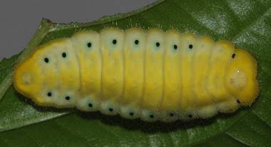 (参考) 成長した幼虫(4齢、19.5mm) 2010年2月21日撮影 静岡市駿河区 飼育 2009年秋 滋賀県北部 採卵 ずいぶんと成長しました。もうすぐ20mmに達しそうです。この黄色は、私にはずいぶんと目立つように思えますが、葉裏にいるとあまり目立たないのかもしれません。気門の周りは鮮やかな空色です。 トップページへ |