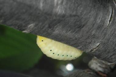 (参考) 幼虫の静止位置と食痕(3齢、12mm) 2010年2月13日撮影 静岡市駿河区 飼育 2009年秋 滋賀県北部 採卵 1日程度で脱皮し、3齢になったようです。クリーム色で、気孔が黒く目立ちます。 トップページへ |
