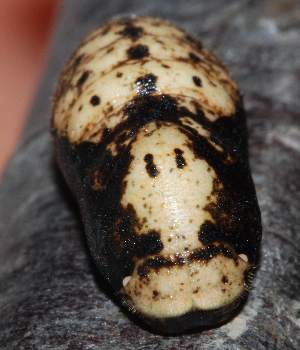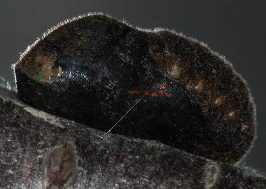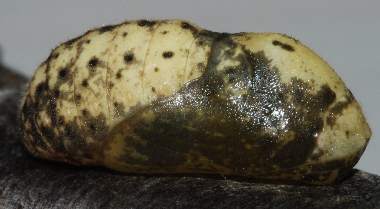 (参考) 羽化前兆を見せるメスアカミドリシジミの蛹(♂) 2010年3月16日撮影 静岡市駿河区 飼育 2009年秋 滋賀県北部 採卵 蛹期20日目で、中の翅が紫色に輝いて見えるようになりました。♂だと分かります。 トップページへ |