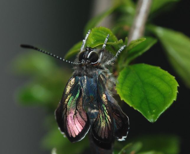 | メスアカミドリシジミはその名の通り、♀の前翅に大きい赤い紋があることにちなみます。後翅にも赤い紋が出ることがあるそうです。私はまだ成虫♀を見たことがありません。♂は、他のChrysozephyrus属と同様に輝く緑の翅が大きな魅力です。比較的低い場所でテリトリーを張り、また場所によって多くの個体がいるので、Chrysozephyrusの中では最も撮りやすいです。私も随分前ですが、目の前で緑銀に輝く本種を撮ることができて大きな感動を得ました。近畿地方では中国山地や比良山地、伊吹山地など比較的高いところで見ることができます。幼虫は他のゼフィルスと異なりサクラ類の蕾・葉を食べます。飼育では、ウメやボケが使えるそうです。 |