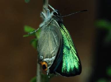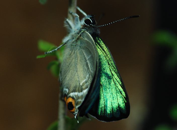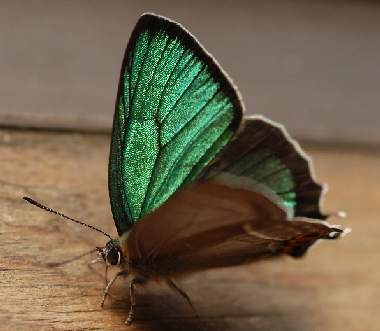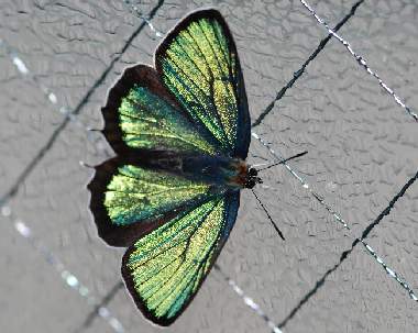 (参考) 羽化直後のメスアカミドリシジミ(♂) 2010年3月16日撮影 静岡市駿河区 飼育 2009年秋 滋賀県北部 採卵 昼に羽化しました。目が覚めるような美しさです。 トップページへ |