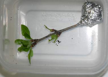(参考) 幼虫(1齢) 2009年3月3日夜中 岡山県新見市 産 大阪市淀川区 飼育 傷つけて食べやすくした葉に食いついています。 トップページへ |