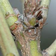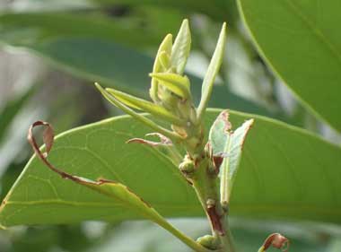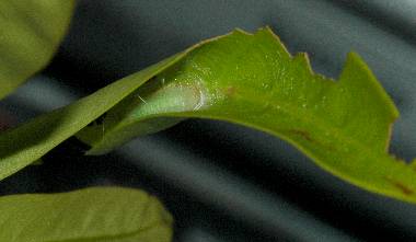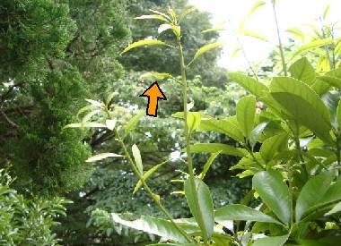 (参考) ムラサキツバメの幼虫の巣 2004年7月21日 神奈川県横浜市港北区日吉 新しく伸びてきた芽です。矢印のところに巣があります。古い葉には巣は見つかりません。 トップページへ |
