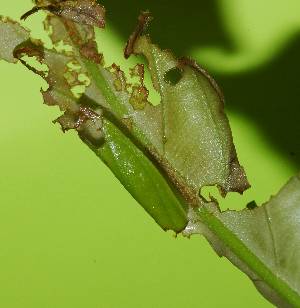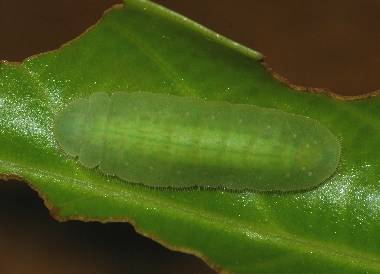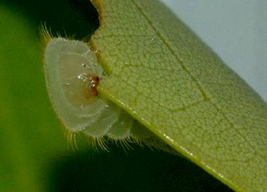 (参考) 幼虫(3齢、7mm) 2004年7月21日 神奈川県横浜市港北区日吉 上が頭です。非常に扁平(へんぺい)で葉に張り付いている感じがします。 トップページへ |