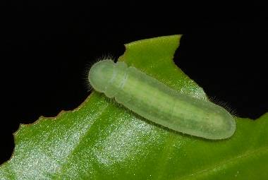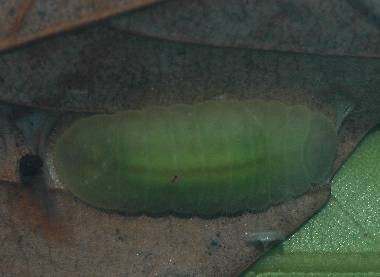 (参考) 幼虫(4齢、12mm) 2004年7月24日 神奈川県横浜市港北区日吉産 大阪市淀川区飼育 食樹マテバシイの葉を食べているところです。左が頭です。 トップページへ |