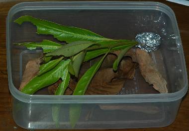 (参考) 飼育の様子 2004年7月25日 神奈川県横浜市港北区日吉産 大阪市淀川区飼育 餌のマテバシイの若い葉と蛹化のための枯葉を一緒に密閉容器に入れています。ふたは一部を軽くしている程度です。若い葉がしおれないようにある程度湿度を保つようにするためにわずかに開けてあります。閉めすぎると湿気がたまりすぎるように思います。 トップページへ |