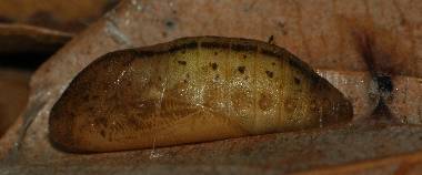 (参考) 蛹(14mm) 2004年8月3日 神奈川県横浜市港北区日吉産 大阪市淀川区飼育 おそらく、7月30日に蛹化したものと思われますが、旅行に行ったので確認できませんでした。枯葉を容器の底からはずして裏返して撮影しました。左が頭。 トップページへ |