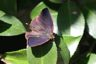 2006年10月22日 大阪府豊中市服部緑地公園 突然、茶色の蝶が舞い、目の前に止まりました。なに?という感じで見ると、いつかは見たいと思っていたムラサキツバメでした。しかもすぐに翅を開いて、その美しい青紫の紋を輝かせていました。新鮮な♀ですから、当地で発生したものでしょう。ただし、右の触角がないようです。どうしたのでしょうか。 トップページへ |