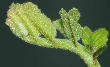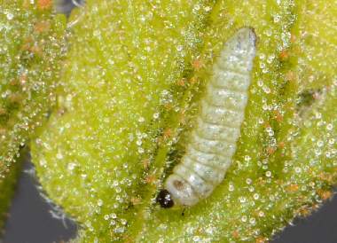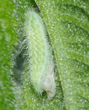 (参考) 成長したオナガシジミの幼虫(1齢、2.5mm、オニグルミ) 2012年4月14、15日撮影 兵庫県北部 採卵 静岡市駿河区 飼育 孵化した幼虫を芽に付けて以来ずっと芽の中に潜んでいて、ときおり糞をしに一部を外に出すことはあったのですが、芽が伸びてきたためか幼虫も見えるようになりました。上が頭です。 トップページへ |