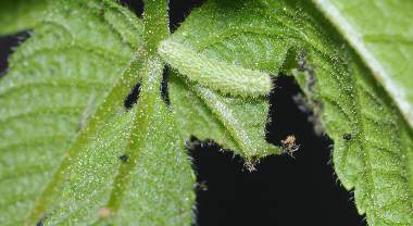 (参考) 眠に入った幼虫(3齢、9.2mm、オニグルミ) 2012年4月27日撮影 兵庫県北部 採卵 静岡市駿河区 飼育 オニグルミはどんどんと新しい葉を出してきます。一番若い葉の裏で静止しています。 トップページへ |