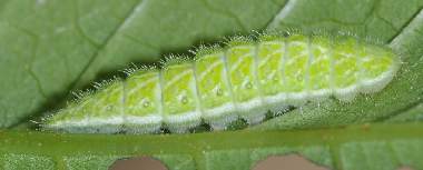 (参考) 少し成長した幼虫(2齢、3.2mm、オニグルミ) 2012年4月17日撮影 兵庫県北部 採卵 静岡市駿河区 飼育 幼虫も成長しますが、オニグルミの葉もどんどん大きくなります。 トップページへ |