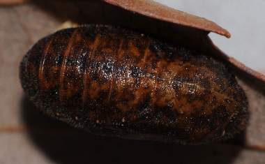 (参考) オナガシジミの蛹(9.8mm) 2012年5月7日撮影 兵庫県北部 採卵 静岡市駿河区 飼育 かなり黒っぽい蛹になりました。前蛹になった葉からなぜかはずれて蛹化してしまったので他の枯葉に尾端をのり付けしました。その後、5月21日に羽化しかけて頭だけ出して動かなくなりました。残念です。 トップページへ |