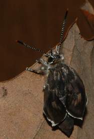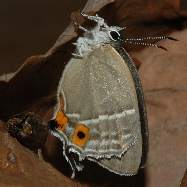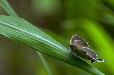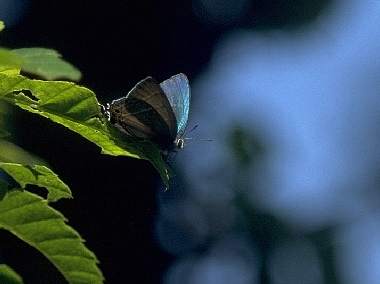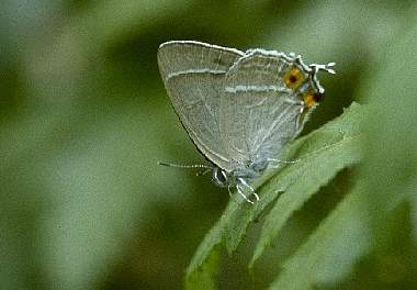 1993年6月27日 兵庫県猪名川町上阿古谷 関西のゼフィルスのメッカ、三草山近くの林道での一こまです。♀はなかなか探して見つかるものではないのですが、たまに地面近くの葉上で開翅したりします。 トップページへ |