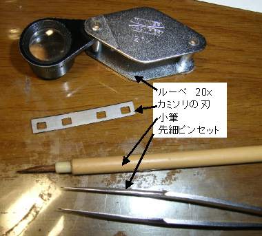 (参考) 飼育の武器 2006年3月18日 ゼフィルスを孵化させるときの飼育用器具です。カミソリの刃は、たまたまあった2枚刃のものから取りだしたものです。慎重に、最後は思い切って、卵の上部に当てるとすっと切れます。もちろん、幼虫を傷つけたらおしまいです。小筆(面相筆)は、幼虫を移動させるのに使います。 トップページへ |