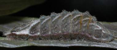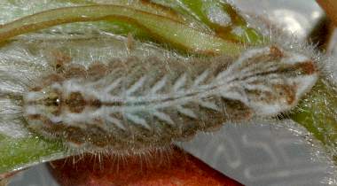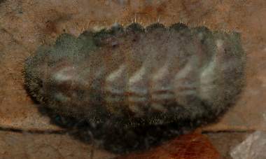 (参考) 蛹化間近の幼虫(4齢、18mm) 2006年4月10日 兵庫県猪名川町産 大阪市淀川区飼育 右が頭。大きくなるにつれて、色が黒っぽくなってきました。 トップページへ |