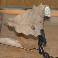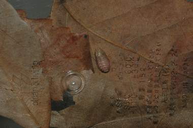 (参考) オオミドリシジミの蛹 2006年4月15日10:18am 兵庫県猪名川町産 大阪市淀川区飼育 蛹化して間もない蛹を容器の下から写したものと、上から見た枯葉の様子です。矢印の先あたりの下側に蛹があります。 トップページへ |