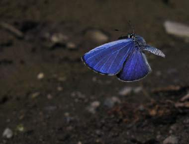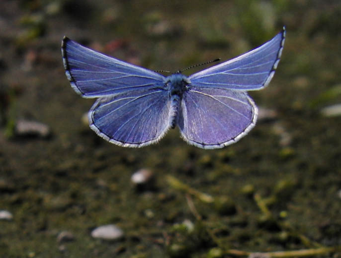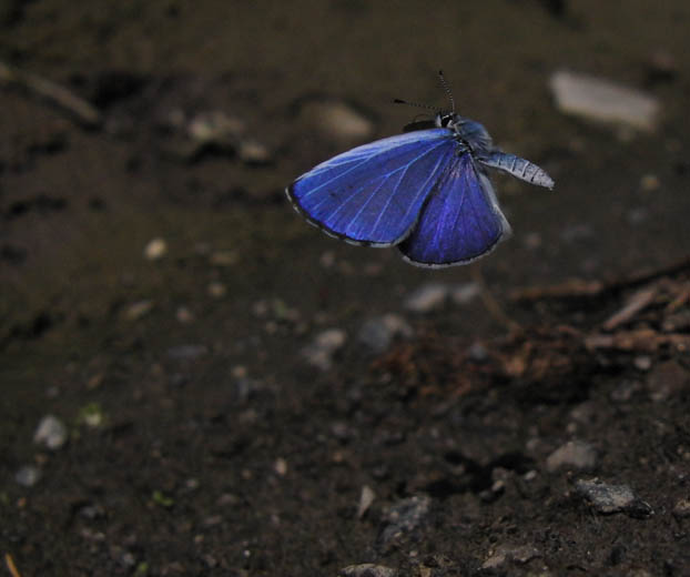 飛翔(吸水後) 2009年5月30日 静岡市駿河区大谷 Casio EX-F1、パスト連写 表面は構造色も含むようで、光の当たり方、カメラの向きによってはかなり紫色を含むようになります。これはブルーのシジミ共通のようですが、程度は異なります。 トップページへ |