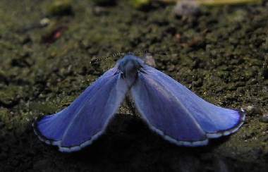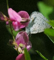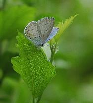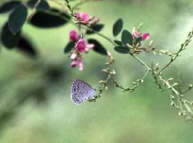 | ルリシジミも大阪市内では珍奇種です。郊外の山では比較的普通に見られ都市部でも食草が豊富なのに少ない、という種は多いですが、これがいったい何に起因しているのでしょうか。“虫の気持ち”はまだまだなぞだらけです。それでもついに2003年6月にハギに産卵しているところを観察・撮影できました。その卵の飼育記録はルリシジミ2にアップしています。また、豊中市服部緑地公園のフジの花で見つけた幼虫の飼育記録はルリシジミ3。また、静岡市駿河区のタラノキの花で見つけた幼虫の飼育記録はルリシジミ4にアップしています。 |