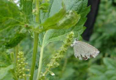 休息 2002年9月23日 大阪市淀川区 我がバタフライガーデンでアカタテハをよぶために植えてあるカラムシの花を訪れました。バタフライガーデンで見たのは初めてです。でも吸蜜しているわけではありません。食草の広いルリシジミのことですから、もしかしたら産卵に訪れたのかもと思い卵を探してみましたが、見つかりませんでした。 トップページへ |