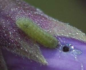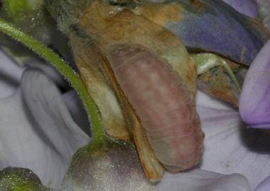シジミチョウ科の幼虫(4齢、12mm)、食べ跡 2005年5月1日 大阪府豊中市服部緑地公園産産 大阪市淀川区飼育 幼虫の色が変わりました。フジの花の中(おしべとめしべ)だけをどんどん食べています。 |