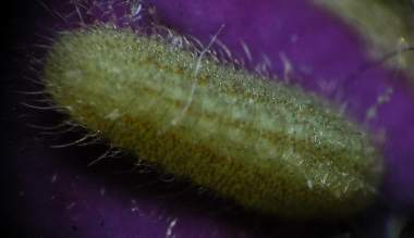ルリシジミの前蛹 2005年5月3日 大阪府豊中市服部緑地公園産産 大阪市淀川区飼育 旅行に行っている間に、前蛹になりました。本来は、茎や枯葉で蛹化するのですが、まだ大丈夫と思っていたため、それらを飼育容器に入れていなかったため、花びら上で前蛹になってしまいました。 |