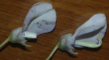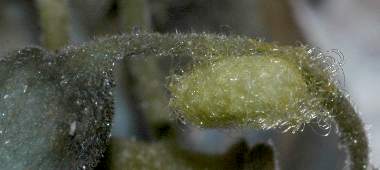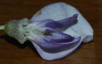 シジミチョウ科の幼虫(4齢?、9mm)、食べ跡 2005年4月28日 大阪府豊中市服部緑地公園産産 大阪市淀川区飼育 庭の一才藤の花で飼育しています。脱皮して歩き始めた、おそらく4齢(終齢)の幼虫です。フジの花に穴を開け(写真中)、中のおしべを食べています。下段の左の写真は、中段の写真の花びらを除いたもの、下段の右は比較です。 |
