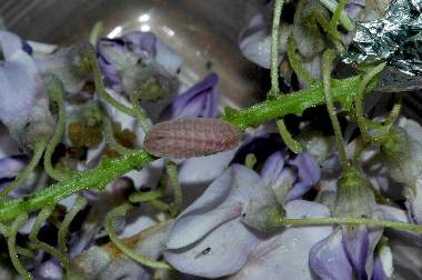 ルリシジミの幼虫(2齢?)と環境 2005年4月23日 大阪府豊中市服部緑地公園 ちょうど、フジが見頃です。そのフジの花の房の蕾に幼虫が3匹見つかりました。これは、蕾に穴を開けて、中のおしべを食べた後です。このときは、ルリシジミとは分かりませんでした。 トップページへ |