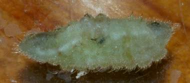 ルリシジミの幼虫(3齢、死亡)、とコマユバチの繭 2005年5月2日 大阪府豊中市服部緑地公園産産 大阪市淀川区飼育 小さい幼虫は死亡し、近くにコマユバチの繭がありました。こんなに小さいうちから寄生されるとは驚きです。 |