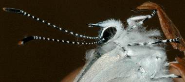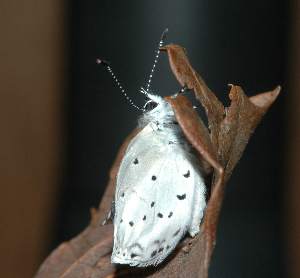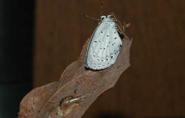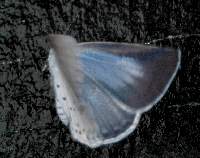 羽化直後のルリシジミ(♀) 2005年5月14日 上1:7:19am 上2:7:28am 下(飛翔):9:23am 大阪府豊中市服部緑地公園産 大阪市淀川区飼育 羽化直後の様子です。顔や触角に毛が付いています。蛹の期間は11日でした。 |