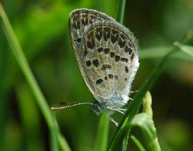 (参考)吸蜜(カラシナ) 1989年10月7日 兵庫県伊丹市 参考までに、兵庫県で撮影した秋型の裏面の写真を示します。青色矢印で示した黒い紋が、ヤマトシジミとの区別点です。本種では上下の紋からずれていますが、ヤマトシジミではきれいに並んでいます。地色も少しシルビアの方が暗いです。翅も少し細い感じです。 トップページへ |