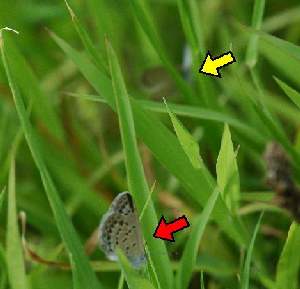 (参考)求愛 上♂下♀ 2004年9月18日 兵庫県伊丹市 かなりぼけて分かりにくいですが、黄色矢印が♂で翅を広げています。下にそのときの写真を示しています。♂と♀の距離は10cmぐらいでした。交尾は拒否され、♀はその後ヤハズソウに産卵しました。 トップページへ |