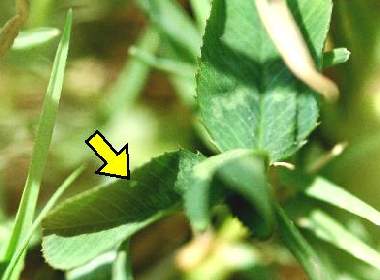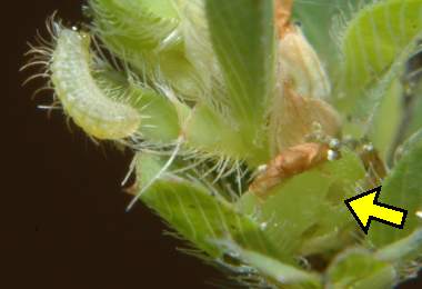 (参考) 幼虫(1齢、2mm、ヤハズゾウ) 2006年10月5日 兵庫県伊丹市産 大阪市淀川区飼育 10月4日には孵化していました。矢印で示すように、若い実の中を食べ、糞もその上にしています。しかし葉は食べた様子が無く、見たときにはうろうろしていました。そこでシロツメクサに移したところ、すぐに食いつきました。 トップページへ |