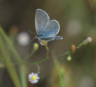 (参考) シルビアシジミの吸蜜(♂、ヌスビトハギ) 2006年9月30日 兵庫県伊丹市 羽化したばかりと思われる♂が、秋の陽光を浴びて翅を開き吸蜜しています。眼のピントは少しはずれています。ヤマトシジミでは翅の表の縁の黒帯がずっと細いです。 トップページへ |