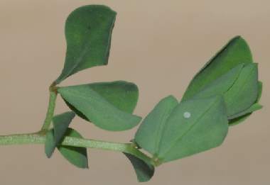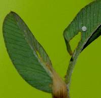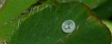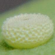 (参考)シルビアシジミの卵(ヤハズソウ) 2004年9月18日 兵庫県伊丹市 上と同じ個体の♀が別の株のヤハズソウに産んだ卵です。産まれた直後は、他の多くのシジミチョウ科の蝶と同様に薄青色です。 トップページへ |