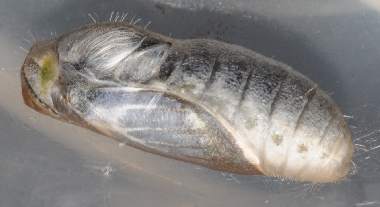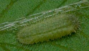 (参考)シルビアシジミの幼虫(4齢、脱皮直後、5mm) 2004年10月8日 兵庫県伊丹市採卵 大阪市淀川区飼育 葉裏で脱皮して4齢(終齢)になりました。 トップページへ |