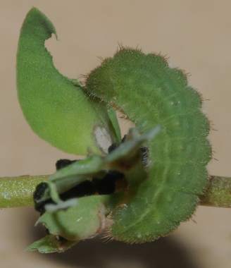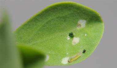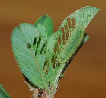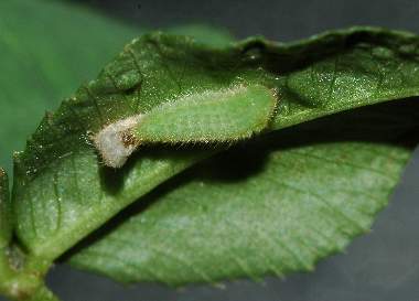 (参考) 葉表を囓るシルビアシジミの幼虫(1.1mm、ミヤコグサ) 2010年10月19日 夜撮影 静岡市駿河区 飼育 兵庫県加古川河川敷 産 夜見ると、葉表に回って葉裏の皮を残して食べていました。 トップページへ |
