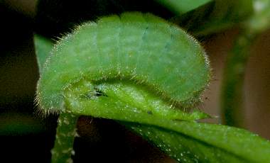 (参考)シルビアシジミの幼虫(4齢、シロツメクサ) 2004年10月23日 兵庫県伊丹市採卵 大阪市淀川区飼育 食べているときの顔です。 トップページへ |
