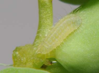 (参考) 少し成長し葉表を囓るシルビアシジミの幼虫(1.4mm、ミヤコグサ) 2010年10月20日 夜撮影 静岡市駿河区 飼育 兵庫県加古川河川敷 産 夜見ると、葉表に回って葉裏の皮を残して食べていました。 トップページへ |