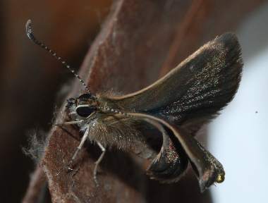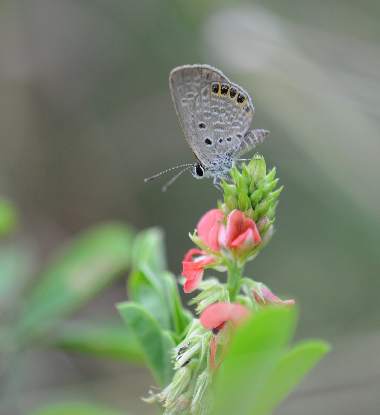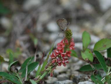 | タイワンヒメシジミは、日本では2003年沖縄県与那国島で発見された迷蝶で、日本土着種に比べ小さい蝶です。定着して土着種となれば、日本最小種となるはずです。このときはヒメノアズキで発生していたそうです。その後2006年、沖縄県西表島でも確認されました。こちらでは、タヌキコマツナギとナンバンコマツナギで発生しているようです(以上参考 双尾U http://www2.bbweb-arena.com/kinaga-y/03taiwannhime.html)。私は2010年3月に、西表島で成虫を観察し、また、持ち帰った卵、幼虫をタヌキコマツナギとインゲンで飼育しました。このとき既にかなり生育面積が少なくなっており、一時的な発生に終わる可能性も高そうです。しかし、温暖化の影響などで他のいくつかの種のように定着する可能性も否定できません。2011年11月にも西表島の新たな産地で観察することができました。 |
