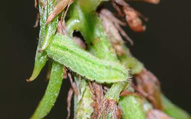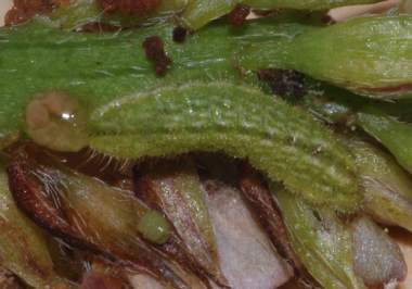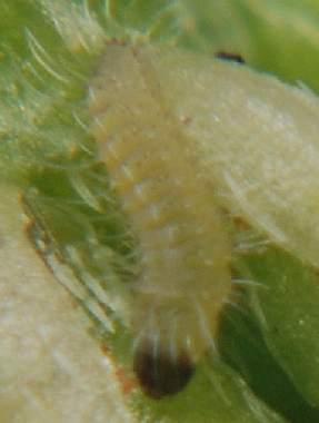 (参考) タイワンヒメシジミの幼虫(2齢、1.5mm) 2010年3月13日 沖縄県西表島南風見 花穂には様々の齢数の幼虫もいました。これはまだ小さいですが、2齢の終わり頃だと思います。これを“個体1”とします。 トップページへ |