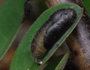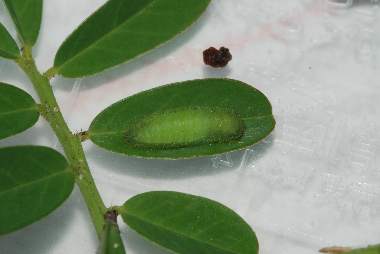 (参考) 幼虫と食痕(4齢、8.5〜9mm、タヌキコマツナギ) 2010年4月10、11日 沖縄県西表島南風見 産 静岡市駿河区 飼育 個体5。終齢になると、赤みがずいぶんとなくなってしまいました。その後蛹化し黒くなったものの羽化しませんでした。 トップページへ |