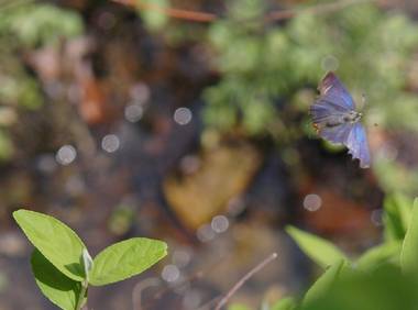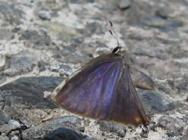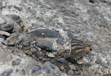 (参考) 吸水と飛び立ち(春型) 2011年4月30日 静岡市葵区中部 Casio EX-F1 パスト連写 コンクリート舗装の林道です。崖から水がしみ出し、道路が濡れていて、ここでいろいろな蝶が吸水していました。トラフシジミも1匹だけですが、あまり落ち着かない様子で場所を変えながら吸水していました。表は鈍い青色ですが、構造色も混じっていて、翅の角度でわずかに光って見えます。 トップページへ |